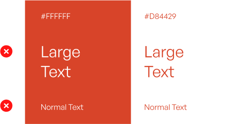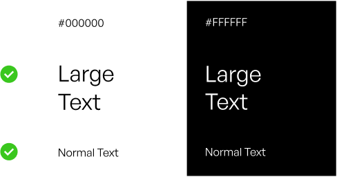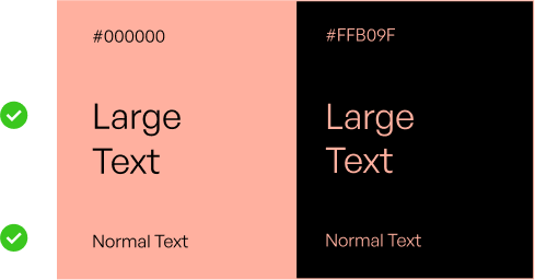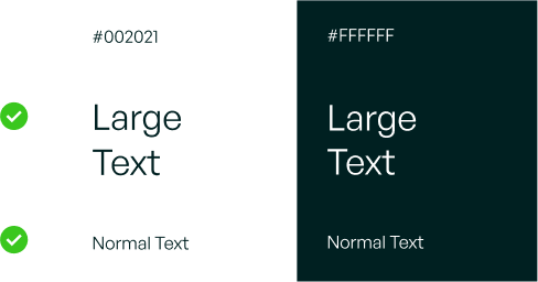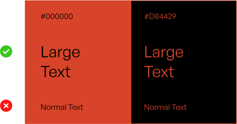 When picking colours for web, we aim to comply with WcAG 2.0 standards for both large and normal text sizes. Large text is 14pt (18.66px) when set in a bold weight, or 18pt (24px) when set in a lighter weight. Any text beneath these sizes is considered normal text.