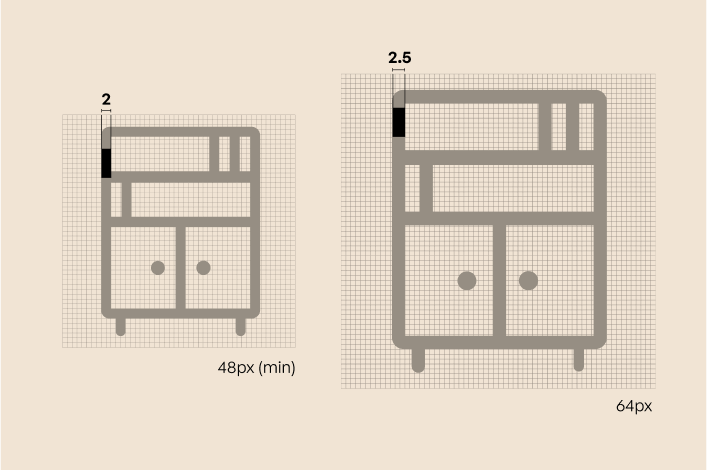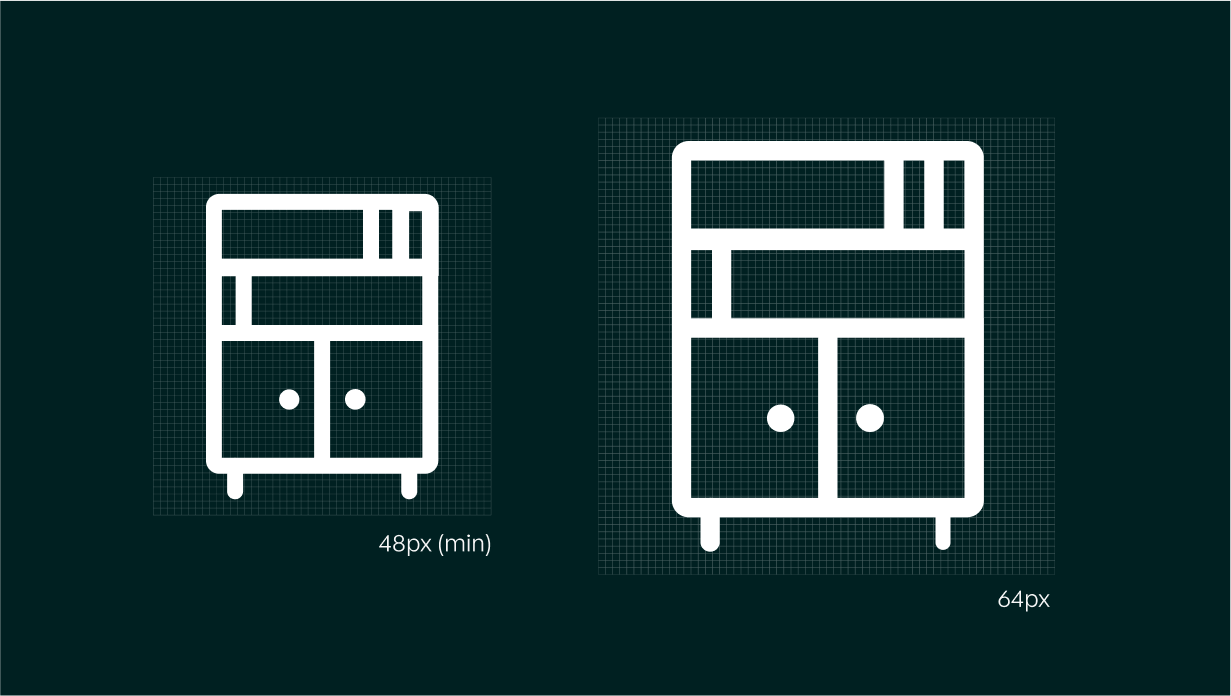 Our icons are crafted on a 48px grid, ensuring proportionate scaling across different interfaces. Key construction guidelines include: