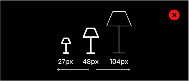 This section outlines common mistakes to avoid when working with icons. Following these guidelines ensures that every icon aligns with our design principles and contributes to a cohesive, polished brand experience. Avoiding these pitfalls helps preserve the simplicity, scalability, and personality that define our icon system.