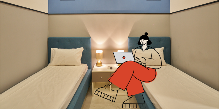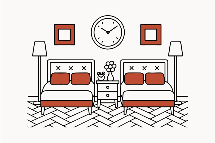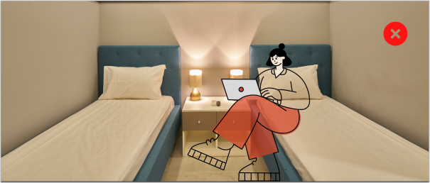Ensure the illustrated figures relate contextually to the environment (e.g., sitting on a bed, interacting with a door, engaging with furniture).