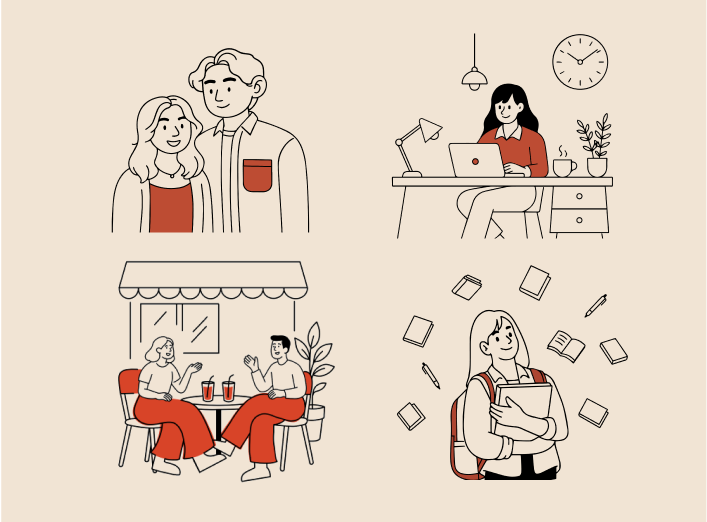 Our illustrations are line-focused, character-led, and grounded in minimalism. Each composition is created with intent and simplicity, avoiding visual clutter while retaining emotion.