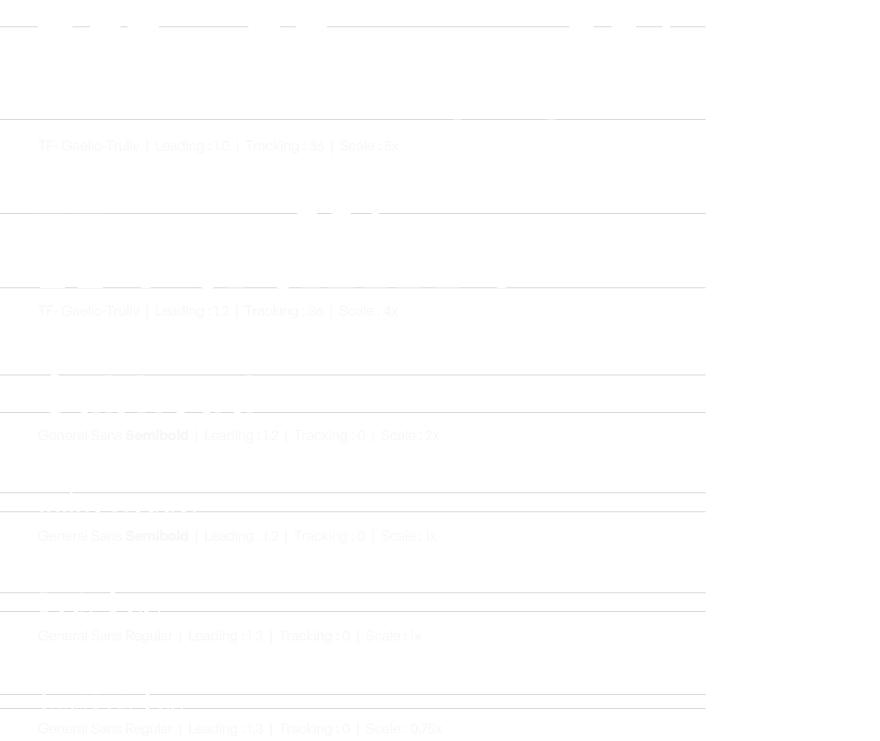Extra large headlines are reserved for high-impact applications where maximum visibility is required. These are typically found on presentation covers, section dividers in slide decks, and various forms of physical signage. Extra Large Headline is set in TF-Gaelic-Truliv